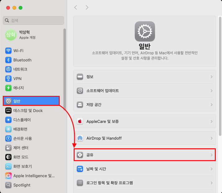 우선 "시스템 설정" -> "일반" -> "공유"로 접근해준다.