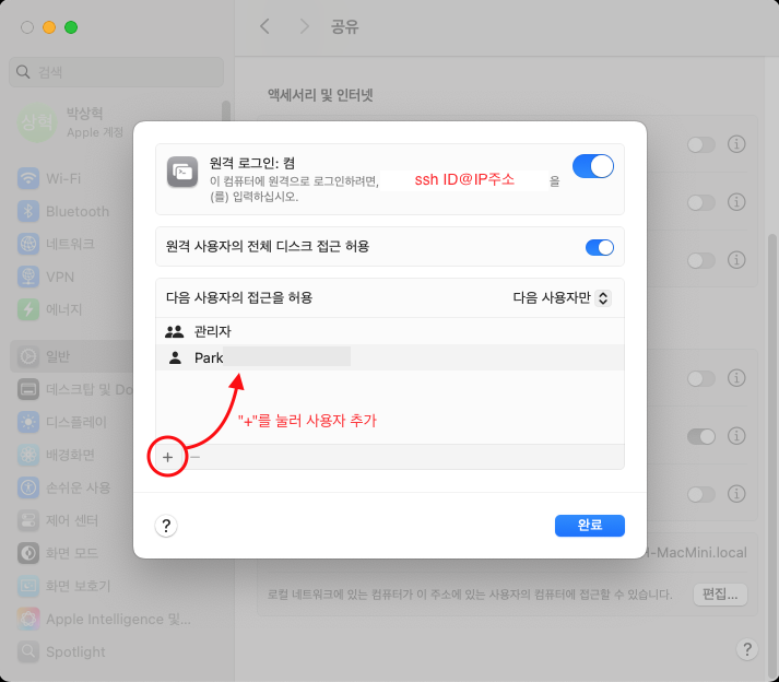 그리고 "원격 로그인: 켬"의 글자를 잘 읽어보면 "ssh ID@IP주소" 형식이 써 있을 것이다.